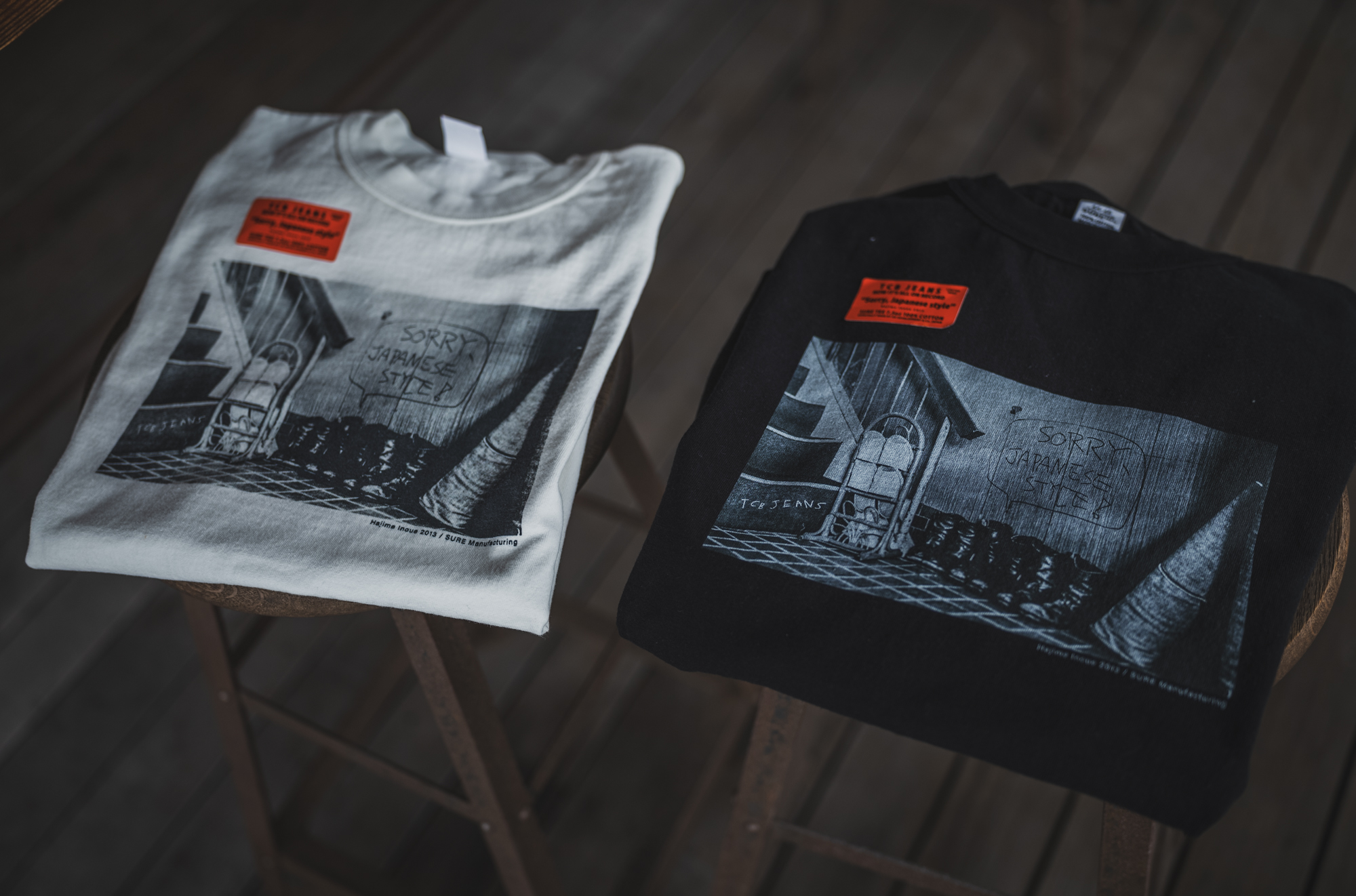 12 years ago, when we didn’t have a full shop space and shoes were not allowed inside the store, TCB gradually started to attract more customers from overseas. We wrote “Sorry Japanese Style” in marker on the wall at the entrance of the store. We took a commemorative photo on February 16, 2013. We never thought we would make a T-shirt with the photo of that time, but since then we have renovated the factory and created a shop space, and compared to back then, we have more people from all over the world coming to our store.