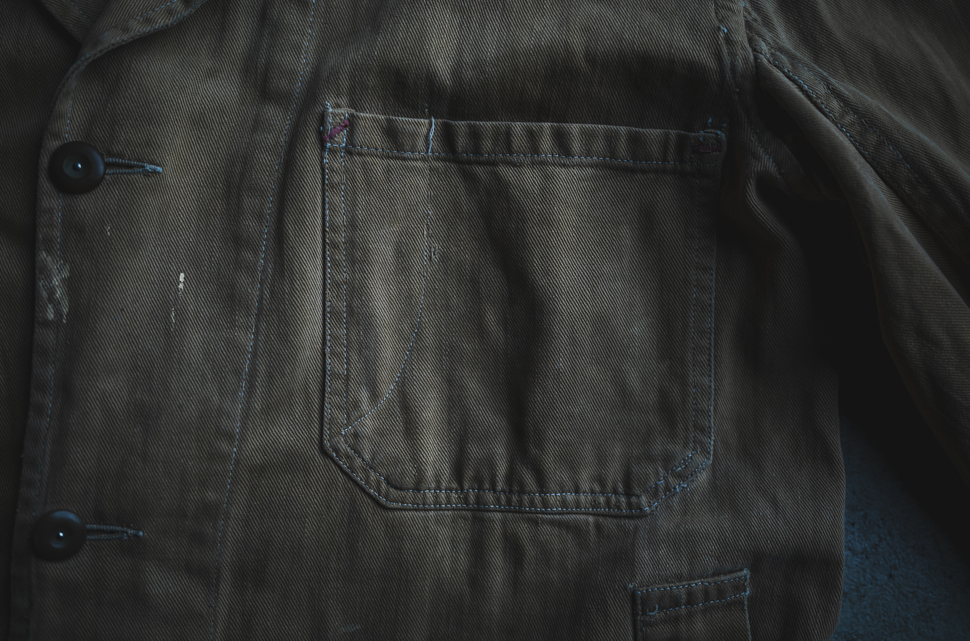 1940〜50年代のCarharttのショップコートに使われていたカーキのドリル生地を元に、別注で再現したものです。