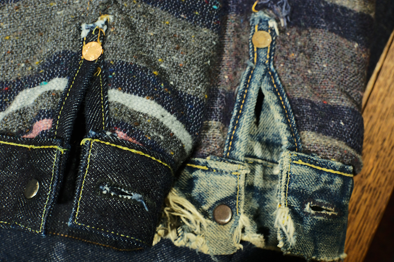 For the lap seams, we use our vintage Union Special with the sewing width of 9/32 inch. Speaking of the process of doing the lap seam, we do it separately for the denim and the wool fabric first and then sew them together on the armpits. If you look at the around-shoulder lap seams on the inner side of the vintage, they are sewn staggered to avoid that the fabrics overlap a lot and get too thick to be sewn. So, we have sewn them in the exact same way as the vintage piece.