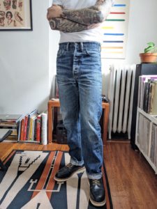 I wanted to have the wavy fades below the knees so I started to wear them with long inseam for me at first and recently have them hemmed with the production spirits from the World War 2 era. I chose 36 for my jacket and 36 for my jeans so the jeans is quite oversized so that I’d worn them above another jeans.
