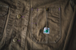 Cat Head JKの縫製上の特徴でもある、グリーンのボタンホールとバータックが